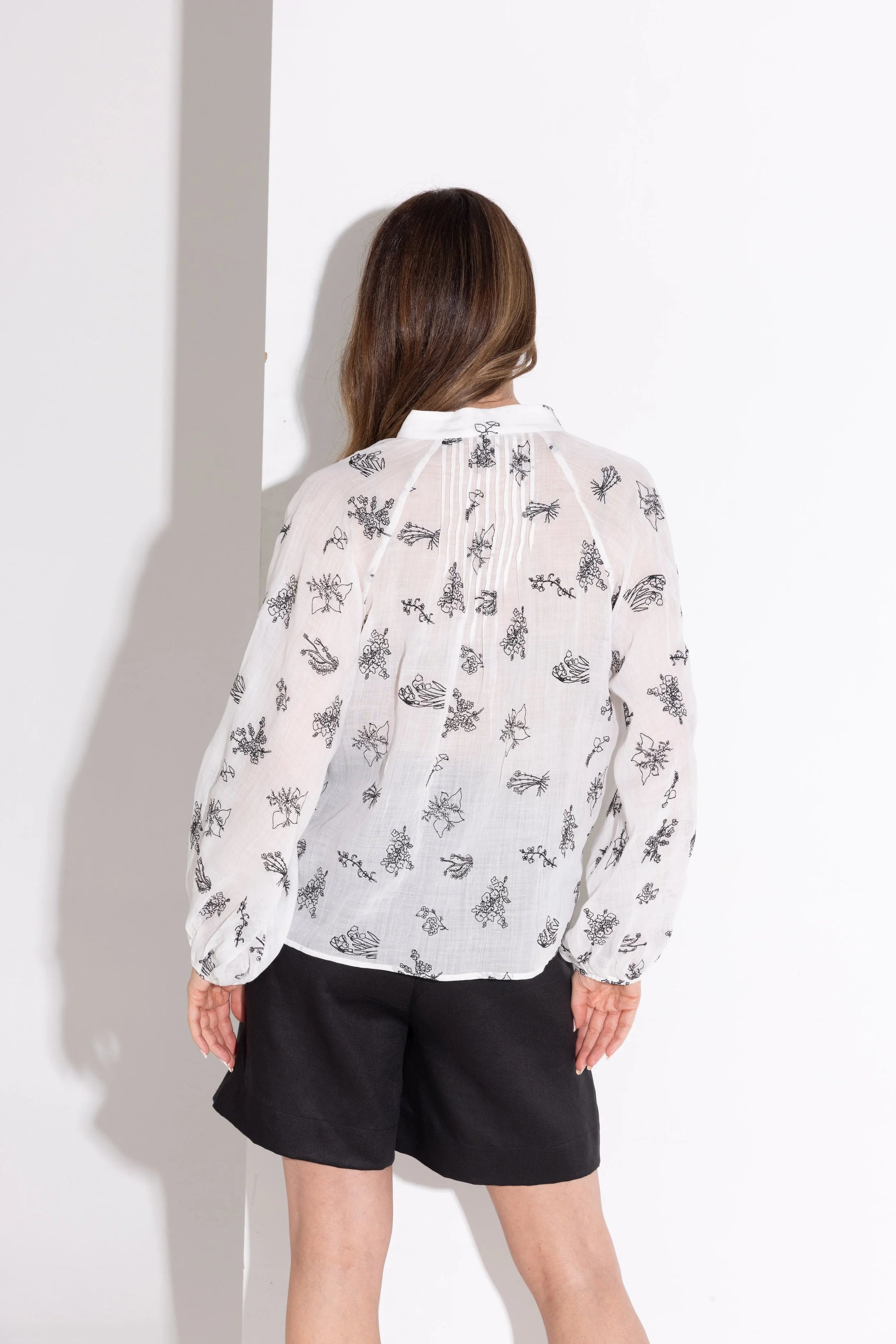 Crafted in lightweight embroidered linen, this relaxed top combines ease and elegance. Featuring a soft V-neckline and button-through front, it’s detailed with subtle black floral embroidery that adds a refined touch. The billowed sleeves with button cuffs bring a relaxed silhouette, while the matching camisole ensures both coverage and comfort. Effortlessly versatile, this piece pairs beautifully with tailored shorts, wide-leg pants, or denim for an elevated everyday look.