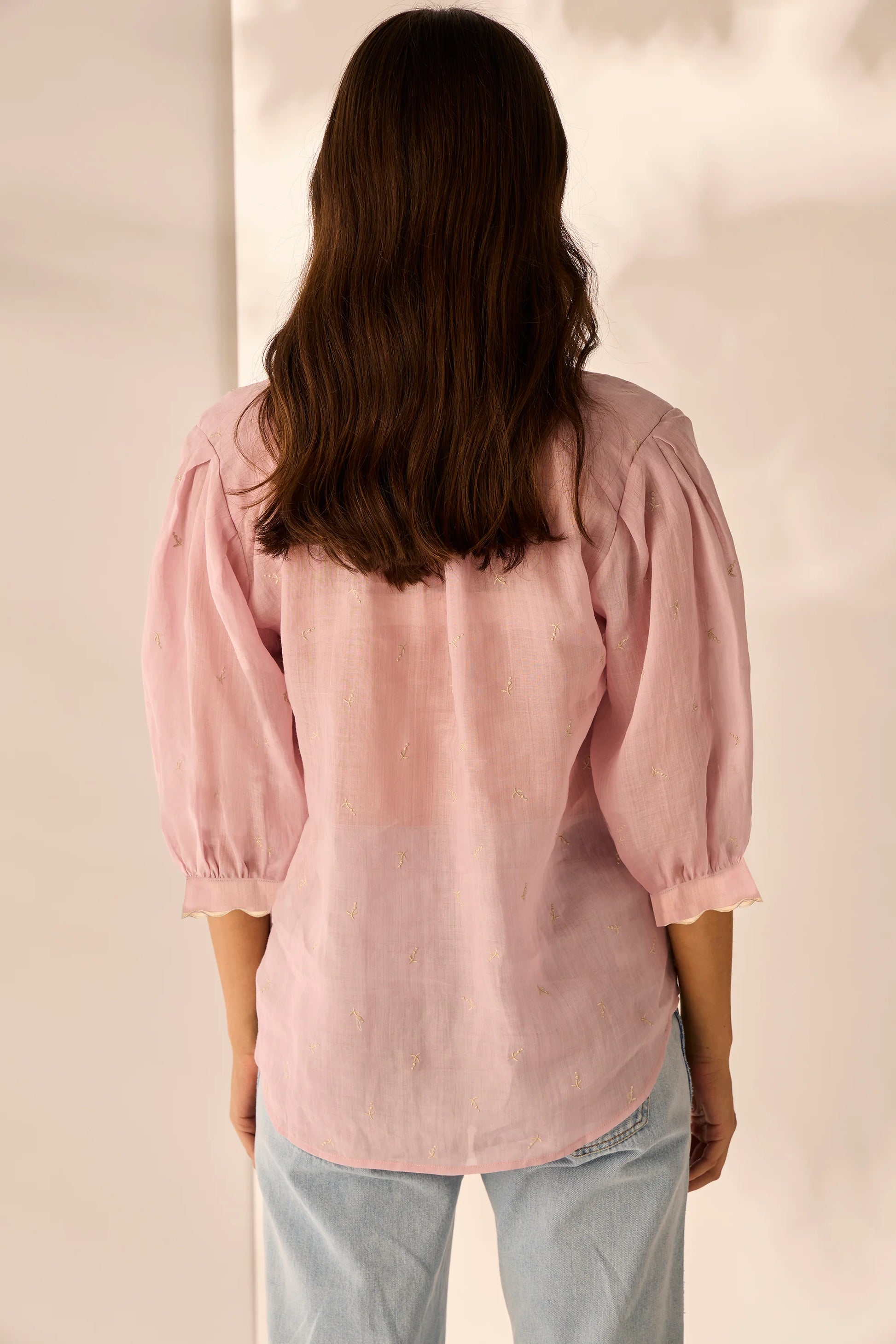 An embroidered Ramie fabrication takes form in a relaxed fit shirt. The soft gathered neckline, glass/ natural round buttons and scallop embroidery border down the centre front placket and cuff all contribute to the refined femininity of this style.